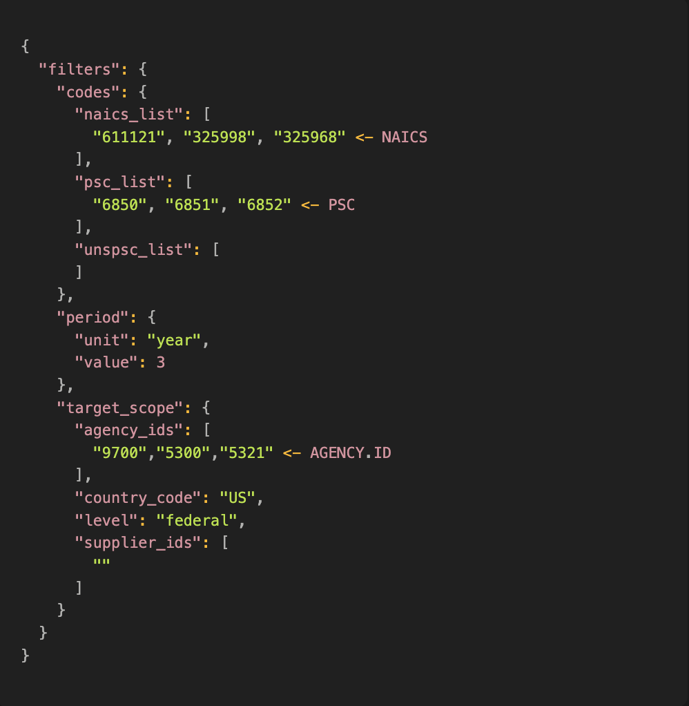 From the top 1,000 most similar solicitations, our AI extracts and filters unique agency names, NAICS codes, and PSC codes.