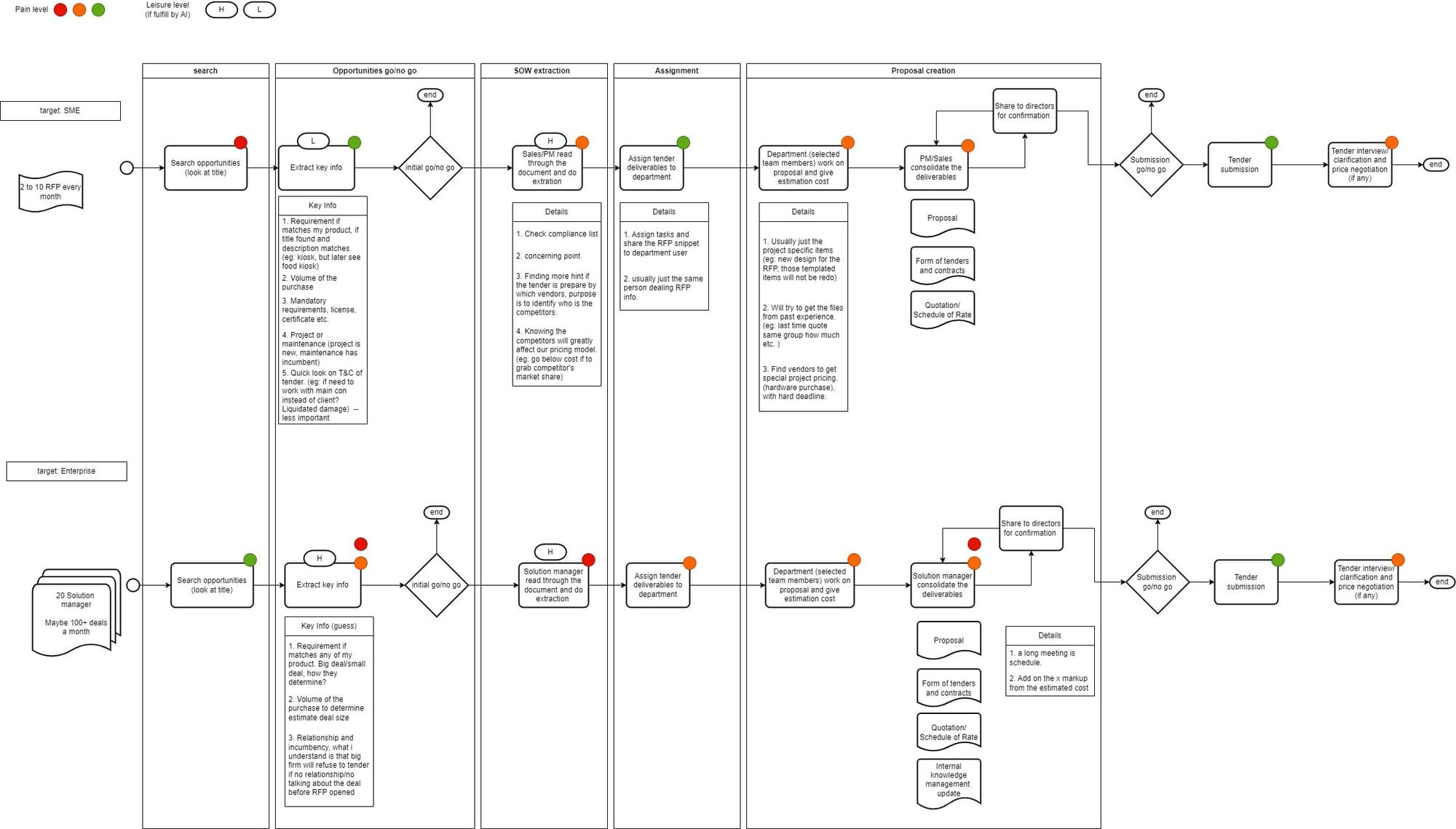 - Enterprises (Low Pain – 🟢): Enterprises have networks with agencies, pre-sales strategies, and lobbying efforts, allowing them to collect and access RFPs efficiently—even before they are officially posted.